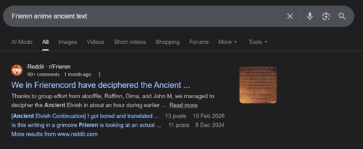 The challenge mentioned Frieren, a well-known anime series. A reverse image search pointed to the Ancient Elvish script used in the anime Frieren: Beyond Journey's End.