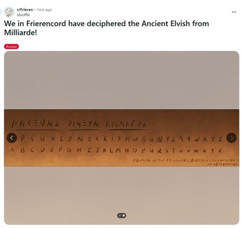 A Reddit post on r/Frieren provided the complete mapping between the Ancient Elvish glyphs and the English alphabet.