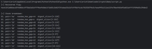 The challenge script processes the flag 2 bytes at a time. For each 2-byte chunk, it computes the SHA-512 hex digest, then takes only a slice of that digest using random indices. Before appending the digest slice, it also prepends a random number of junk bytes.