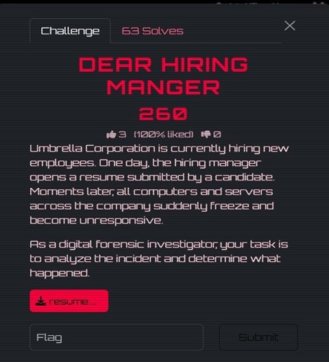 Umbrella Corporation is currently hiring new employees. One day, the hiring manager opens a resume submitted by a candidate. Moments later, all computers and servers across the company suddenly freeze and become unresponsive. As a digital forensic investigator, your task is to analyze the incident and determine what happened.