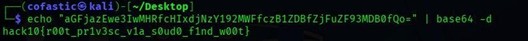 bash$ echo "aGFjazEwe3IwMHRfcHIxdjNzY192MWFfczB1ZDBfZjFuZF93MDB0fQo=" | base64 -d