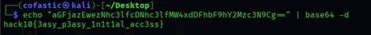 bash$ echo "aGFjazEwezNhc3lfcDNhc3lfMW4xdDFhbF9hY2Mzc3N9Cg==" | base64 -d