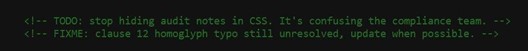 HTML Comments<!-- TODO: stop hiding audit notes in CSS. It's confusing the compliance team. -->