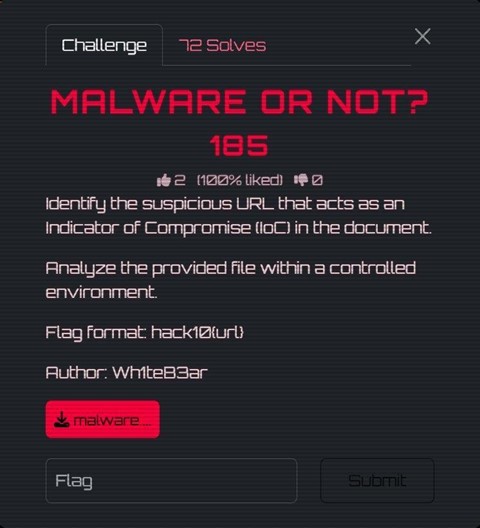 We are given a file called malware__1_.doc and tasked with finding a suspicious URL hidden within the document. The flag format is code