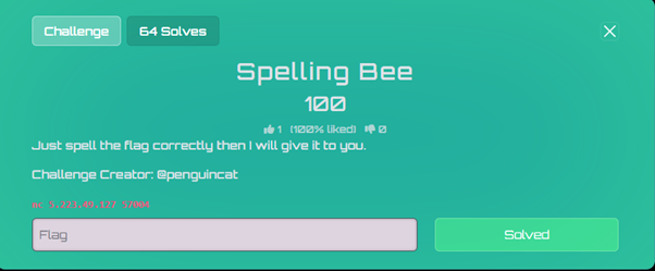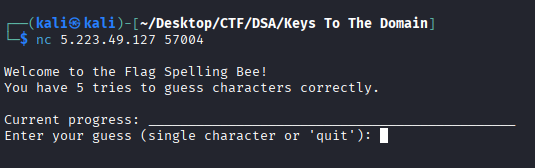 Spelling Bee ChallengeThe "Flag Spelling Bee" was a misc category CTF challenge that required guessing characters one by one to reveal a hidden flag. You only get 5 attempts per connection before being kicked out.