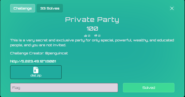 Private Party ChallengeThe "Private Party" challenge involves a Flask web application protected by an HAProxy reverse proxy. The goal is to access a user dashboard to retrieve a flag.