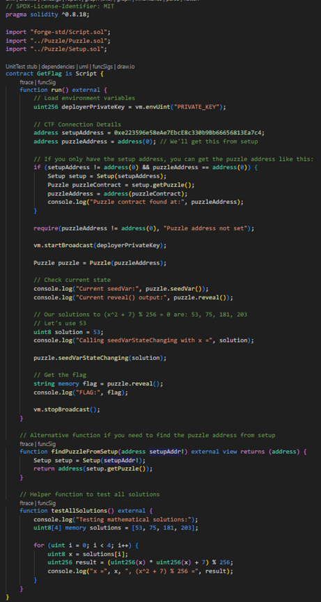 Puzzle ChallengeThe challenge provides two main contracts: Setup.sol (the deployment/setup contract) and Puzzle.sol (the main puzzle contract with the encryption/decryption logic).